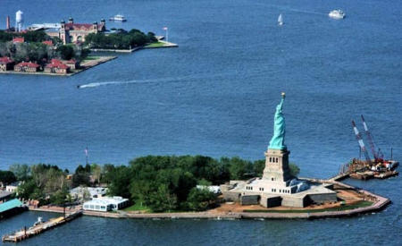 This helicopter view shows the nearness of Ellis Island to Lady Liberty (SteveEmber)