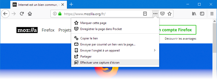 Firefox Screenshots pour la capture d'écranFirefox Screenshots est une fonctionnalité permettant de prendre des captures de parties visibles d’une page web, voire de la page entière, et de copier ou enregistrer ces images. Des modifications ont été apportées à Firefox Screenshots en 2019, consultez ce billet du blog Mozilla pour des précisions. Pour utiliser Firefox Screenshots, cliquez sur le bouton de menu