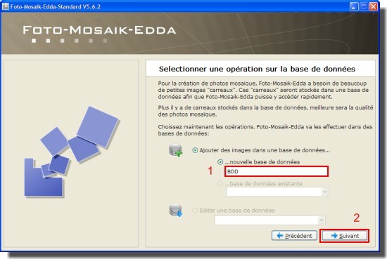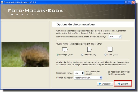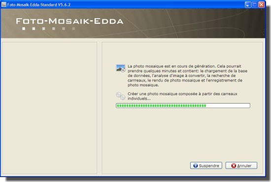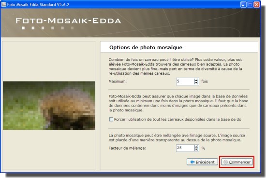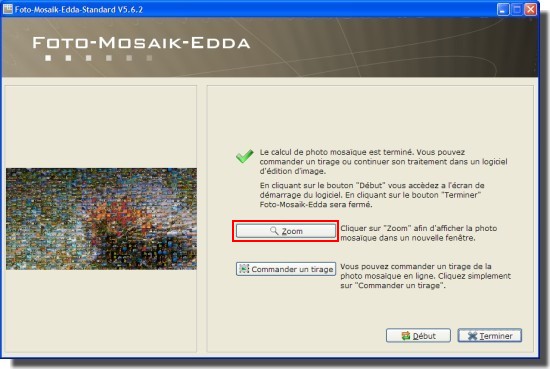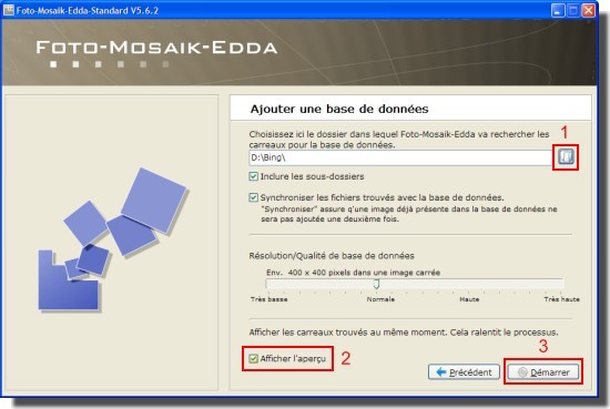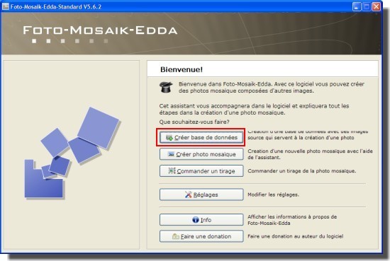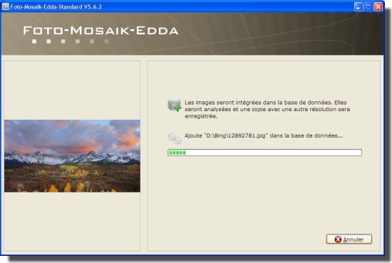 ![]() Foto-Mosaik Edda (Gratuit et en Français) vous permet d’éditer facilement des mosaïques d’images composées d’une multitude de photographies issues de votre collection personnelle. Un assistant vous guide pas à pas dans l’élaboration de chaque mosaïque. Voici un tutoriel en 11 étapes pour la création d’une photo mosaïque. Étape 1Choisir un répertoire contenant beaucoup d’images ou de photos qui seront utilisées comme miniatures dans l’image finale. Plus il y aura d’images et plus le résultat sera au TOP ! Étape 2Donner un nom à votre base de donnée, il est possible d’en créer plusieurs car lors de l’étape 8 il vous sera demandé à partir de quelle base de donnée vous voulez créer l’image finale. Étape 3Ajouter des images dans votre base de donnée. Pour cela il suffit de sélectionner le répertoire de votre disque dur où se trouve vos images. Il est possible de prendre en compte les sous dossiers (option coché par défaut). Étape 4Création des miniatures de la base de donnée. Étape 5Une fois les étapes 1 à 4 réalisées il faut maintenant choisir l’image finale qui sera composée de vos images miniature, donc l’image mosaïque ! Étape 6Sélectionner l’image ou la photo qui sera composer de miniature (la photo mosaïque), puis où on doit enregistrer le résultat final, avant de cliquer sur [Suivant]. Étape 7Choisir la ou les bases de données à utiliser pour la création de la photo mosaïque. Étape 8Pour ma part j’ai rien touché, mais il est possible de faire quelques réglages sur les miniatures qui vont composer la photo mosaïque. Étape 9En fonction du nombre d’images dans la base de donnée, il faut modifier le nombre de fois qu’une miniature pourra être utilisée dans l’image finale. Plus le nombre d’images de votre base de donnée est importantes plus le chiffre peut être réduit, et à l’inverse moins vous avez d’images plus il faudra augmenter ce chiffre. Étape 10Si les consignes de l’étape 9 sont respectées alors la création de la photo mosaïque se passera sans problème ! Dans le cas contraire cliquer sur [Annuler] et retour à l’étape 9… Étape 11Après quelques minutes en fonction de la rapidité de votre PC, cliquer sur [Zoom] pour voir le résultat. Affichage du résultatZoomTélécharger : Foto-Mosaik |