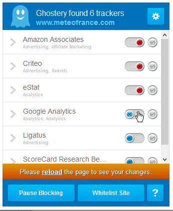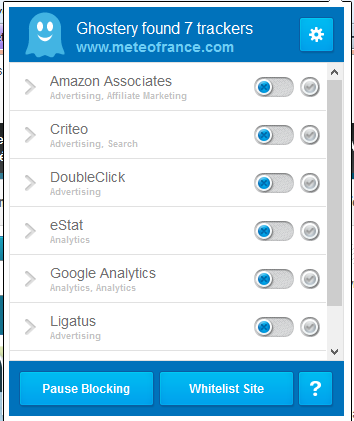 ![]() Au cours de votre navigation vous verrez en bas à droite une fenêtre comme celle-ci : Ce sont les noms des sociétés, des réseaux publicitaires qui sont intéressés par votre comportement et votre activité sur Internet. ![]() Grâce à Ghostery, vous pouvez bloquer cette surveillance. Un clic sur l'icone en haut à droite donne ceci : l'image montre que sur le site de Météo France sept entreprises me pistent. En